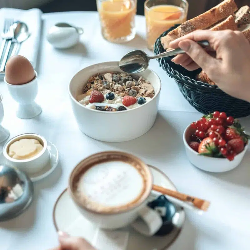 Every morning, we serve an Italian-inspired breakfast buffet with pastries, fresh fruit, bread, hot drinks and warm dishes. A simple and tasty moment to start the day well.